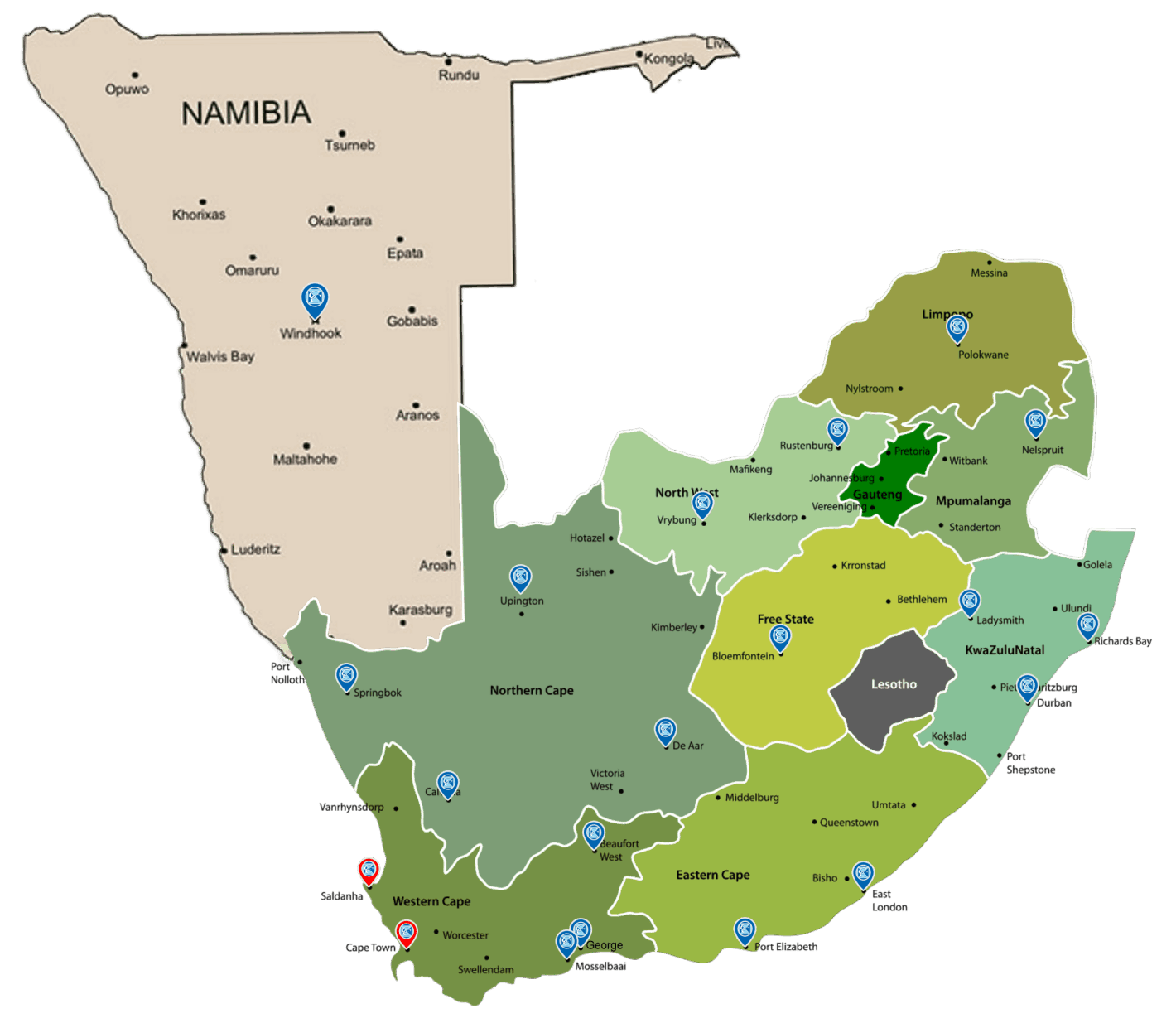 *Cape Town *Saldanha *Beaufort West *Mossel Bay *George *Port Elizabeth *East London *Springbok *Calvinia *De Aar *Upington *Kimberley *Bloemfontein *Durban *Richards Bay *Ladysmith *Vryburg *Klerksdorp *Rustenburg *Johannesburg *Pretoria *Nelspruit *Polokwane *Windhoek